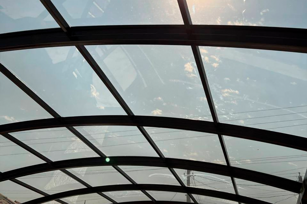 - Высокопрочный. В 250 раз прочнее стекла. Выдерживает снеговую нагрузку до 560 кг/м². Защищает от града. Исключительная ударопрочность.